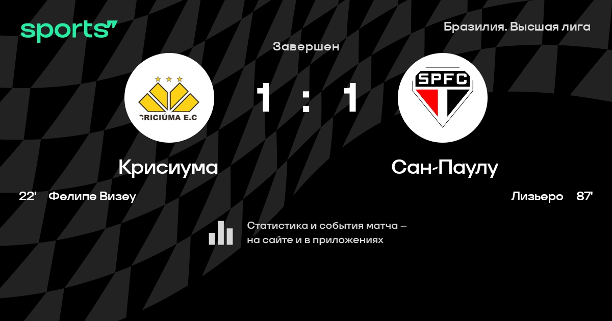 Результат прошлой игры в турнире «Серия A»: Ботафого – Крисиума 1:1. После 30 туров Крисиума набирает 36 очков и занимает 12 место в турнире. Лучший бомбардир команды – Феллипе Матеус: он забил 6 в 44 матчах. В последних 5 играх Крисиума забивает 5 голов. В последних 5 играх Крисиума пропускает 3 голов.