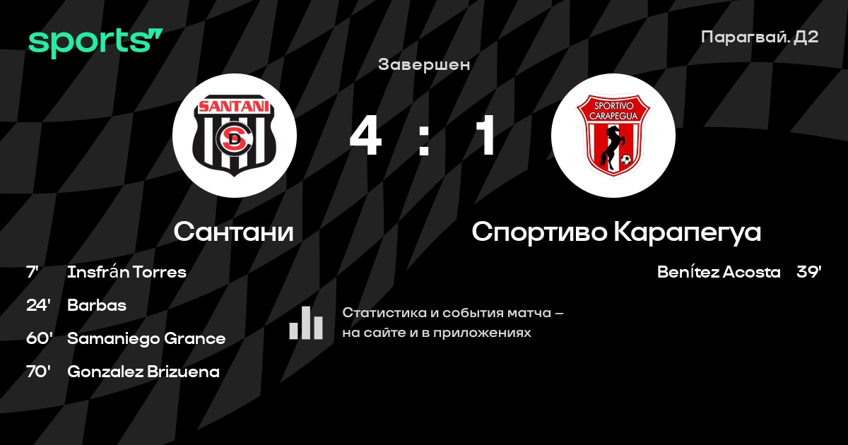Результат прошлой игры в турнире «Сегунда»: Индепендьенте – Сантани 1:1. После 24 туров Сантани набирает 26 очков и занимает 12 место в турнире. Лучший бомбардир команды – B. Barbas: он забил 5 в 15 матчах. Сантани не проигрывает в 6 последних матчах в рамках турнира «Сегунда». В 4 последних матчах в турнире «Сегунда» Сантани обязательно забивает. В последних 5 играх Сантани забивает 7 голов. В последних 5 играх Сантани пропускает 3 голов.