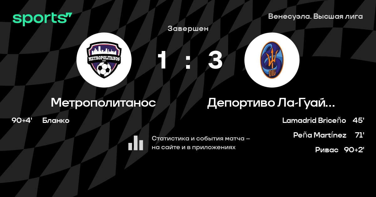 Результат прошлой игры в турнире «Примера»: Карабобо – Метрополитанос 0:0. После 13 туров Метрополитанос набирает 16 очков и занимает 8 место в турнире. Лучший бомбардир команды – Мику: он забил 5 в 7 матчах. Депортиво Ла-Гуайра имеет в активе больше всех побед в турнире – 7. В последних 5 играх Метрополитанос забивает 5 голов. В последних 5 играх Метрополитанос пропускает 7 голов.