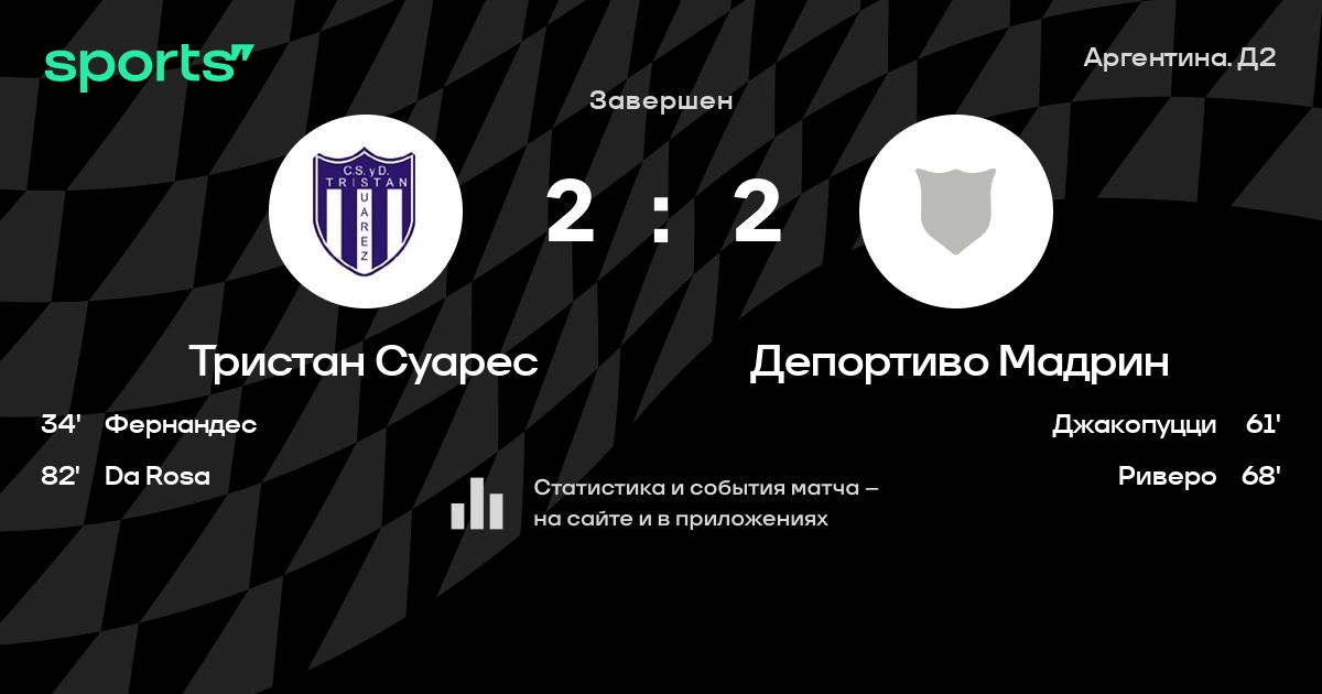 Результат прошлой игры в турнире «Примера B Насьональ»: Депортиво Майпу – Тристан Суарес 1:0. После 26 туров Тристан Суарес набирает 39 очков и занимает 4 место в турнире. Лучший бомбардир команды – Альваро Вельес: он забил 6 в 23 матчах. В последних 5 играх Тристан Суарес забивает 4 голов. В последних 5 играх Тристан Суарес пропускает 3 голов.