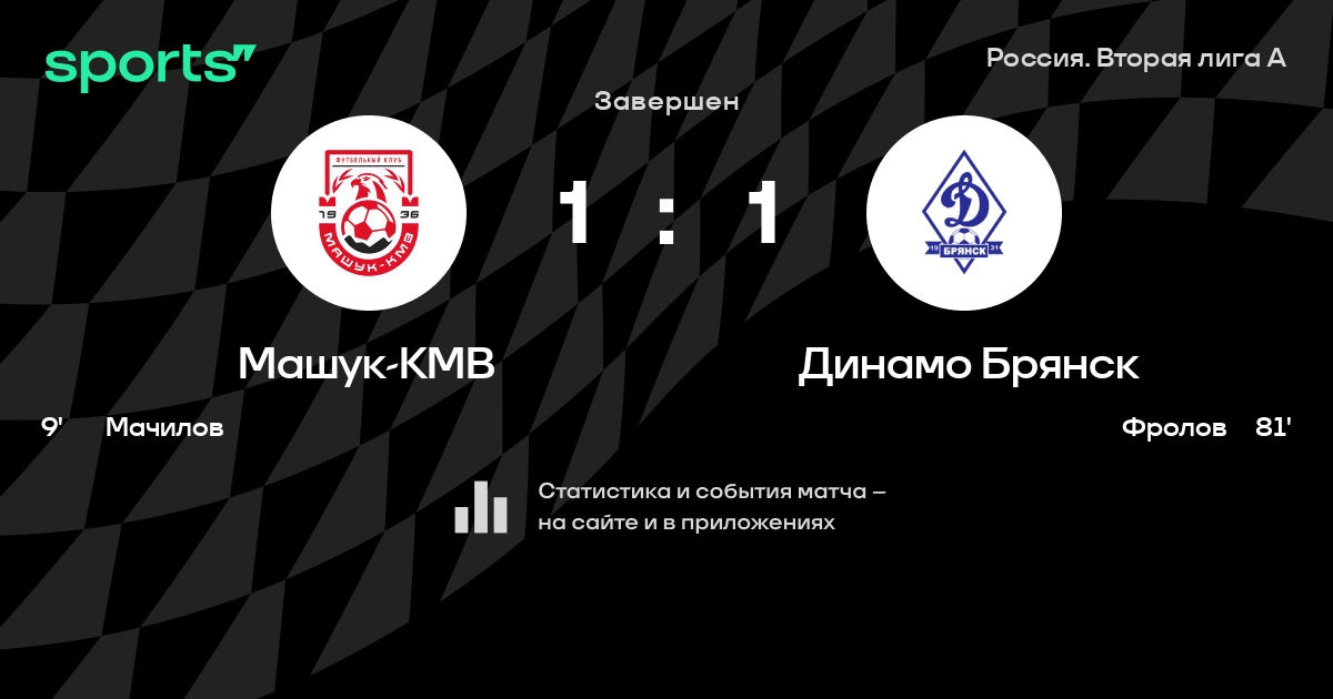 Результат прошлой игры в турнире «Россия. Вторая лига А»: Химик – Машук-КМВ 2:2. После 17 туров Машук-КМВ набирает 24 очков и занимает 4 место в турнире. Лучший бомбардир команды – A. Khutov: он забил 5 в 16 матчах. Машук-КМВ не может выиграть в 3 последних матчах в рамках турнира «Россия. Вторая лига А». Машук-КМВ пропускает в 6 последних матчах в турнире «Россия. Вторая лига А». В последних 5 играх Машук-КМВ забивает 7 голов. В последних 5 играх Машук-КМВ пропускает 8 голов.