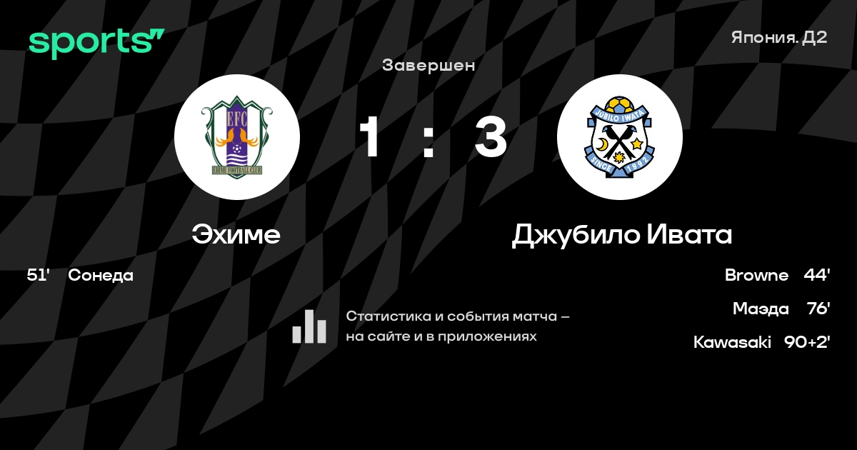 Результат прошлой игры в турнире «Лига 2»: Иваки – Эхиме 2:1. После 33 туров Эхиме набирает 20 очков и занимает 20 место в турнире. Лучший бомбардир команды – R. Sato: он забил 5 в 32 матчах. В 3 последних матчах в турнире «Лига 2» Эхиме обязательно забивает. В последних 5 играх Эхиме забивает 7 голов. В последних 5 играх Эхиме пропускает 9 голов.