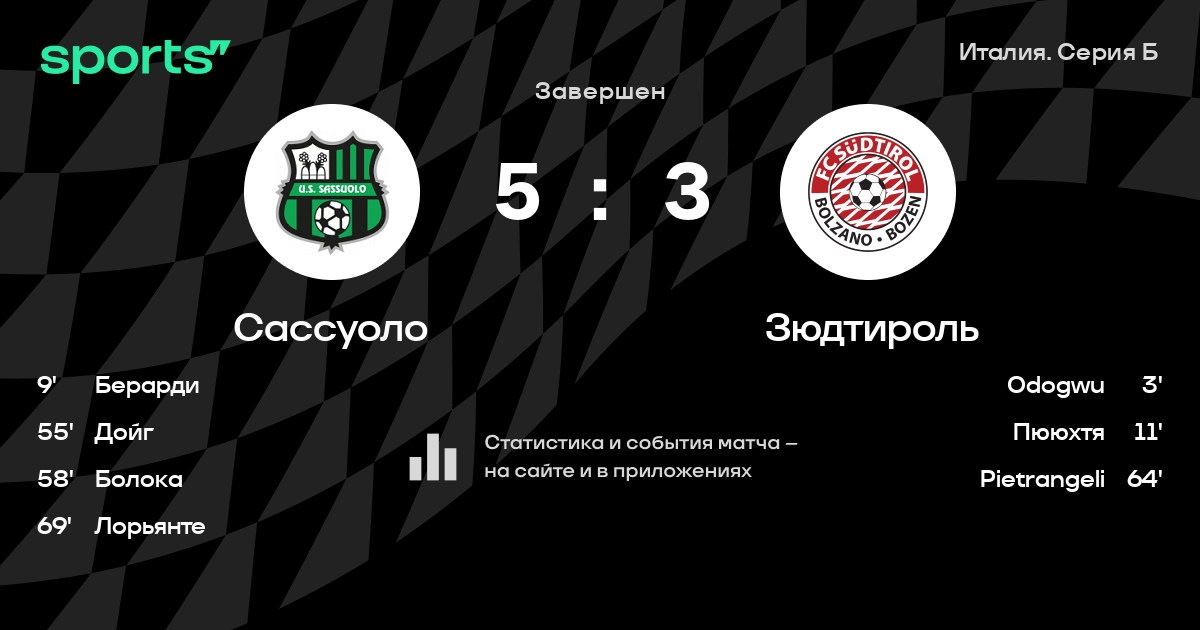Результат прошлой игры в турнире «Серия B»: Салернитана – Сассуоло 1:2. После 21 туров Сассуоло набирает 49 очков и занимает 1 место в турнире. Лучший бомбардир команды – Арман Лорьянте: он забил 9 в 19 матчах. Сассуоло имеет в активе больше всех побед в турнире – 15. Сассуоло имеет лучшую разницу мячей в турнире – 25. В 14 последних матчах в турнире «Серия B» Сассуоло обязательно забивает. Сассуоло пропускает в 6 последних матчах в турнире «Серия B». Сассуоло больше всех забивает в турнире – 45 в 21. В последних 5 играх Сассуоло забивает 9 голов. В последних 5 играх Сассуоло пропускает 7 голов.