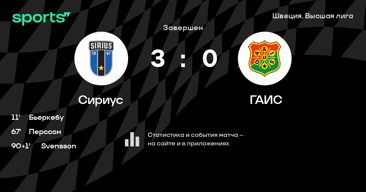 Результат прошлой игры в турнире «Аллсвенскан»: АИК – Сириус 2:1. После 22 туров Сириус набирает 23 очков и занимает 12 место в турнире. Лучший бомбардир команды – Робби Юр: он забил 10 в 22 матчах. В 6 последних матчах в турнире «Аллсвенскан» Сириус обязательно забивает. Сириус пропускает в 3 последних матчах в турнире «Аллсвенскан». В последних 5 играх Сириус забивает 14 голов. В последних 5 играх Сириус пропускает 5 голов.