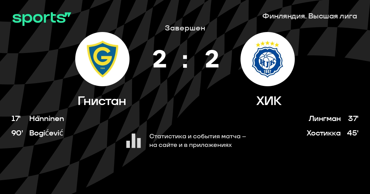 Результат прошлой игры в турнире «Высшая лига»: КуПС – Гнистан 1:1. После 30 туров Гнистан набирает 32 очков и занимает 6 место в турнире. Лучший бомбардир команды – Йоаким Латонен: он забил 11 в 38 матчах. Гнистан не может выиграть в 4 последних матчах в рамках турнира «Высшая лига». В 5 последних матчах в турнире «Высшая лига» Гнистан обязательно забивает. Гнистан пропускает в 10 последних матчах в турнире «Высшая лига». В последних 5 играх Гнистан забивает 9 голов. В последних 5 играх Гнистан пропускает 12 голов.