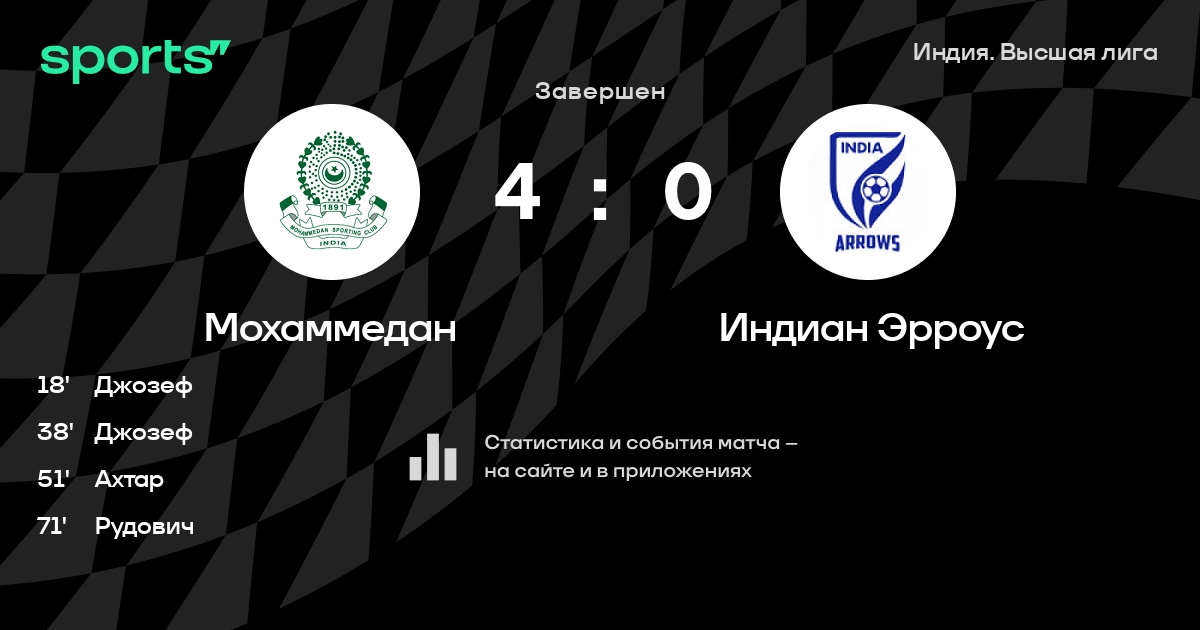 Результат прошлой игры в турнире «Индия. Высшая лига»: Мохаммедан – Sreenidi Deccan 3:1. После 3 туров Мохаммедан набирает 9 очков и занимает 2 место в турнире. Лучший бомбардир команды – Маркус Джозеф: он забил 5 в 3 матчах. Мохаммедан побеждает в 3 последних матчах в рамках турнира «Индия. Высшая лига». В 3 последних матчах в турнире «Индия. Высшая лига» Мохаммедан обязательно забивает. В последних 5 играх Мохаммедан забивает 8 голов. В последних 5 играх Мохаммедан пропускает 5 голов.