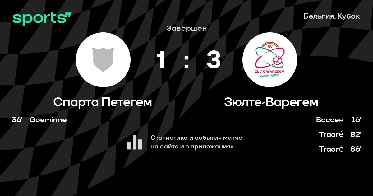 Результат прошлой игры в турнире «Кубок Бельгии»: Спарта Петегем – Расинг Мехелен 3:2. Спарта Петегем побеждает в 3 последних матчах в рамках турнира «Кубок Бельгии». В 3 последних матчах в турнире «Кубок Бельгии» Спарта Петегем обязательно забивает. Спарта Петегем пропускает в 3 последних матчах в турнире «Кубок Бельгии». В последних 5 играх Спарта Петегем забивает 8 голов. В последних 5 играх Спарта Петегем пропускает 11 голов.