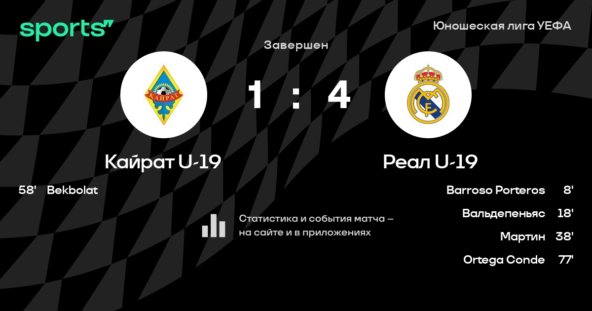Результат прошлой игры в турнире «Юношеская лига УЕФА»: Спортинг U-19 – Кайрат U-19 3:2. Кайрат U-19 проигрывает в 3 последних матчах в рамках турнира «Юношеская лига УЕФА». Кайрат U-19 пропускает в 5 последних матчах в турнире «Юношеская лига УЕФА». В последних 5 играх Кайрат U-19 забивает 9 голов. В последних 5 играх Кайрат U-19 пропускает 16 голов.