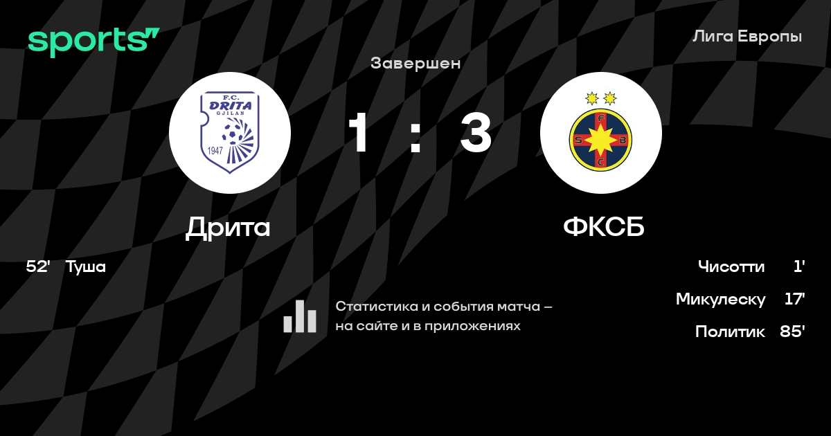 Результат прошлой игры в турнире «Лига Европы»: ФКСБ – Дрита 3:2. В последних 5 играх Дрита забивает 6 голов. В последних 5 играх Дрита пропускает 8 голов.