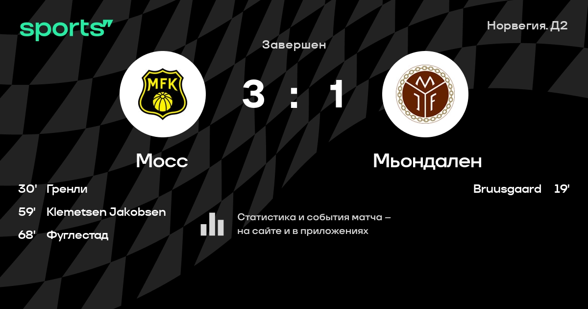 Результат прошлой игры в турнире «Первый дивизион»: Согндаль – Мосс 3:1. После 20 туров Мосс набирает 22 очков и занимает 13 место в турнире. Лучший бомбардир команды – B. Isufi: он забил 4 в 16 матчах. Мосс не может выиграть в 5 последних матчах в рамках турнира «Первый дивизион». В 3 последних матчах в турнире «Первый дивизион» Мосс обязательно забивает. Мосс пропускает в 3 последних матчах в турнире «Первый дивизион». В последних 5 играх Мосс забивает 6 голов. В последних 5 играх Мосс пропускает 9 голов.