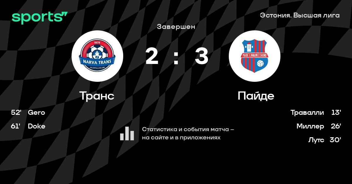 Результат прошлой игры в турнире «Высшая лига»: Курессааре – Транс 0:0. После 29 туров Транс набирает 47 очков и занимает 5 место в турнире. Лучший бомбардир команды – J. Doke: он забил 9 в 27 матчах. Транс не может выиграть в 4 последних матчах в рамках турнира «Высшая лига». В последних 5 играх Транс забивает 6 голов. В последних 5 играх Транс пропускает 6 голов.