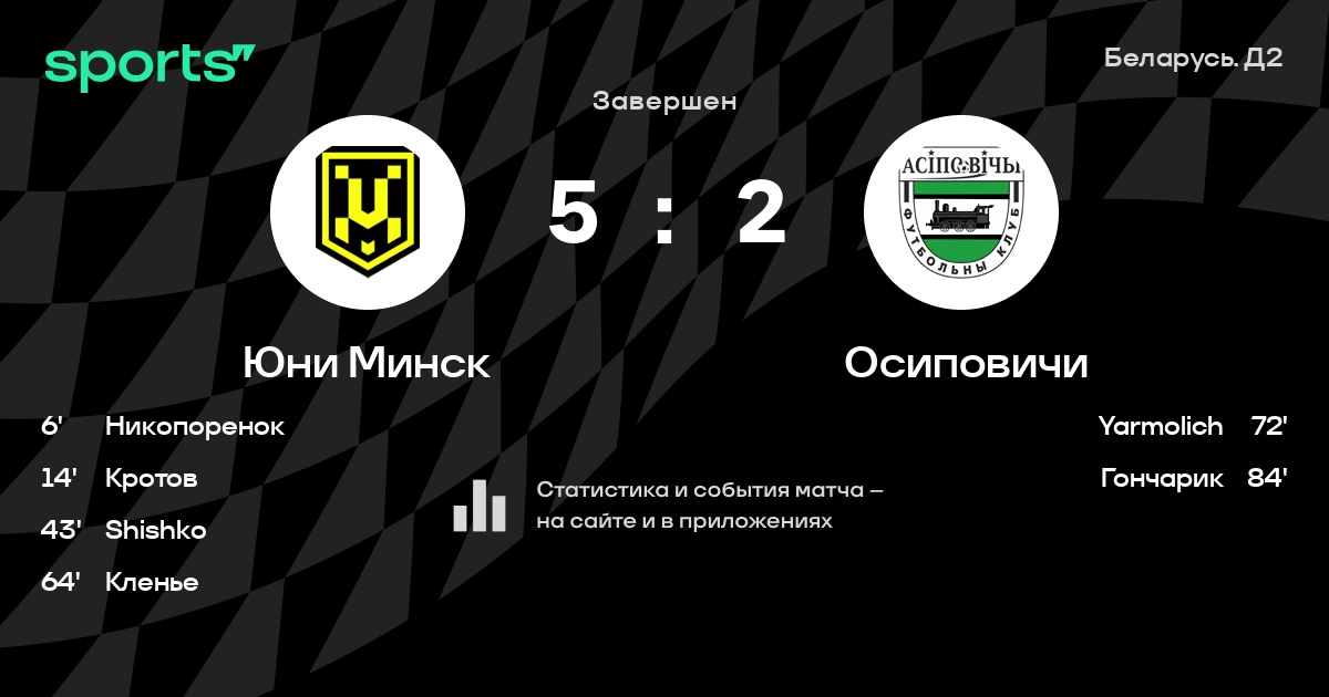 Володьков - - Емельянов, Гончарик, Ломако, Artem Perepechko, Елезаренко - Nikita Solomatin, Платон, Кунский, Стаин, Ivan KorzhenevskiyЗапасные: Gurinovich, Азаров, Malykh, Kukhotskovolets, Minkevich, Zverev, Grin, Yarmolich, Емельянов