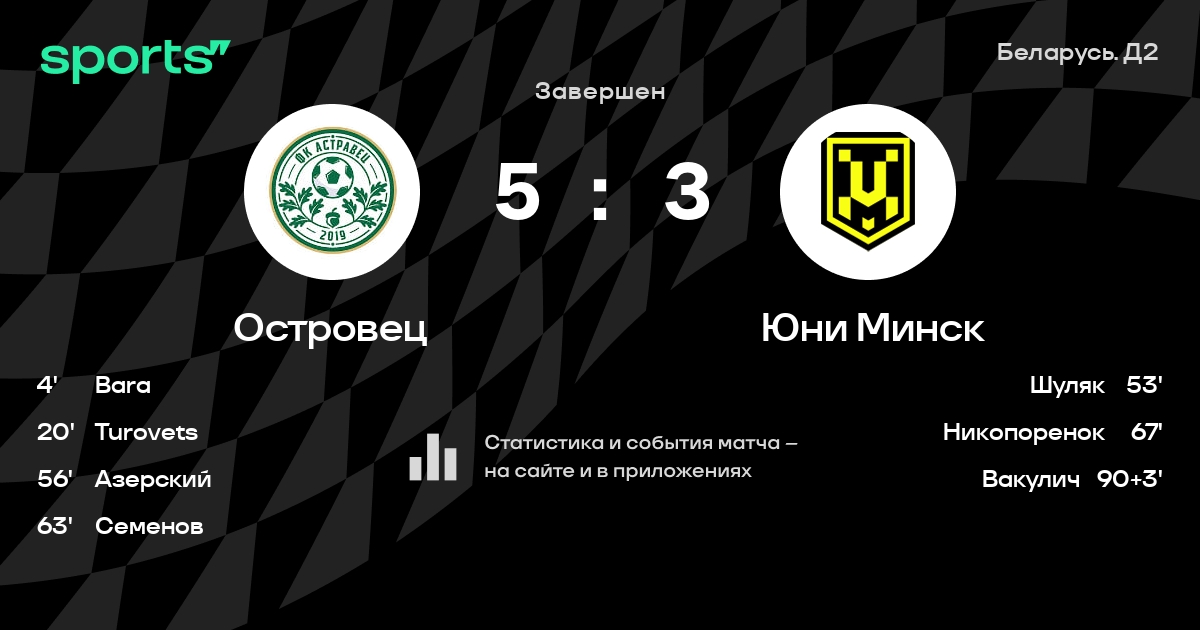 Результат прошлой игры в турнире «Первая лига»: Осиповичи – Островец 0:2. После 27 туров Островец набирает 39 очков и занимает 10 место в турнире. Лучший бомбардир команды – I. Tolkachev: он забил 9 в 27 матчах. В 9 последних матчах в турнире «Первая лига» Островец обязательно забивает. В последних 5 играх Островец забивает 8 голов. В последних 5 играх Островец пропускает 6 голов.