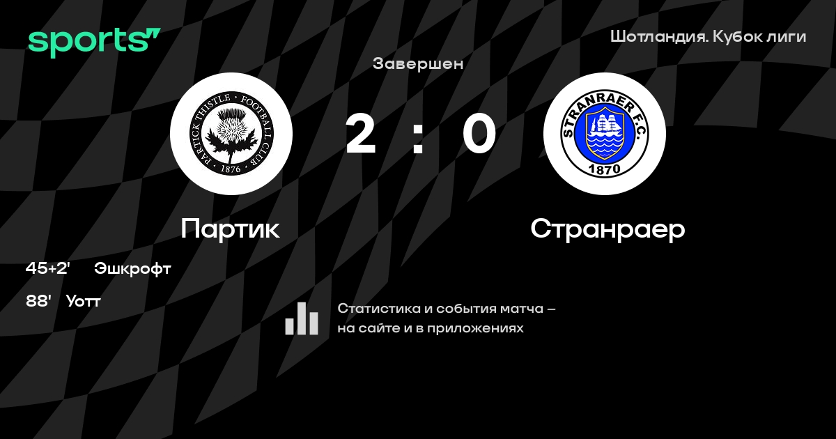 Результат прошлой игры в турнире «Кубок лиги»: Странраер – Росс Каунти 1:1 (6:5). В последних 5 играх Странраер забивает 7 голов. В последних 5 играх Странраер пропускает 6 голов.