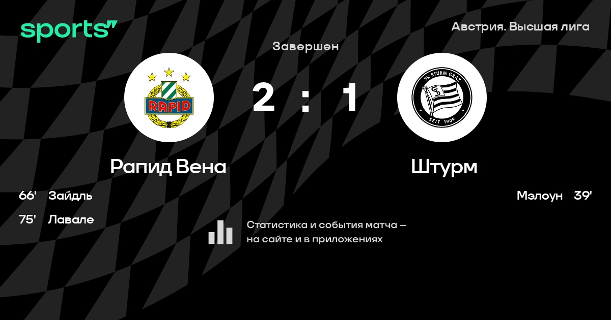 Результат прошлой игры в турнире «Бундеслига»: Рид – Рапид Вена 0:2. После 11 туров Рапид Вена набирает 20 очков и занимает 3 место в турнире. Лучший бомбардир команды – Клоди Мбюйи: он забил 6 в 12 матчах. Штурм имеет в активе больше всех побед в турнире – 7. В последних 5 играх Рапид Вена забивает 4 голов. В последних 5 играх Рапид Вена пропускает 7 голов.