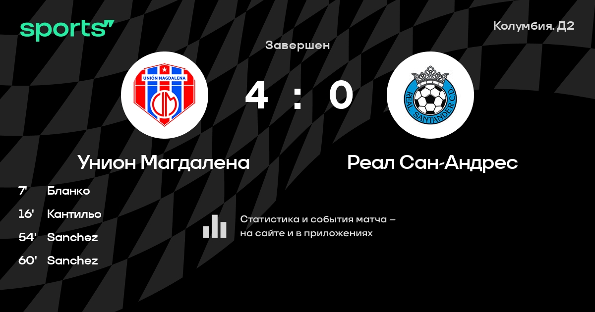 Результат прошлой игры в турнире «Примера Б»: Реал Картахена – Унион Магдалена 2:0. После 16 туров Унион Магдалена набирает 27 очков и занимает 5 место в турнире. Лучший бомбардир команды – A. Carreño: он забил 11 в 22 матчах. Унион Магдалена пропускает в 4 последних матчах в турнире «Примера Б». В последних 5 играх Унион Магдалена забивает 7 голов. В последних 5 играх Унион Магдалена пропускает 5 голов.