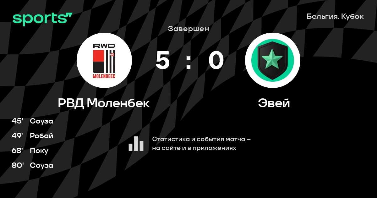 В последних 5 играх РВД Моленбек забивает 5 голов. В последних 5 играх РВД Моленбек пропускает 7 голов.