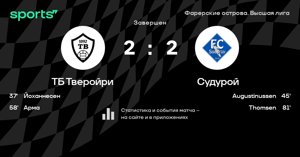 Результат прошлой игры в турнире «Высшая лига»: ТБ Тверойри – Б-36 Торсхавн 0:5. После 23 туров ТБ Тверойри набирает 11 очков и занимает 10 место в турнире. Лучший бомбардир команды – Самудин Муса: он забил 9 в 22 матчах. ТБ Тверойри проигрывает в 4 последних матчах в рамках турнира «Высшая лига». ТБ Тверойри пропускает в 6 последних матчах в турнире «Высшая лига». В последних 5 играх ТБ Тверойри забивает 4 голов. В последних 5 играх ТБ Тверойри пропускает 20 голов.
