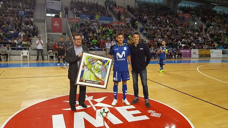 «Пальма Футзал» выдала ударный старт, одержав 6 побед при 1-ой домашней ничьей с одним из клубов «большой тройки» Примеры - «Эль Посо», а посему по праву занимала верхнюю строчку турнирной таблицы. Лучшей проверки собственных сил и амбиций, чем поединок с действующим чемпионом не сыскать, поэтому «Зелёные» были полны желания на деле доказать гостям из столицы, что лидерство «Пальмы» в чемпионской гонке – - это всерьёз и надолго. Многообещающим смотрелось и противостояние голкиперов – Карлоса Баррона (именно он, а не новоиспечённый чемпион Мира Нико Сармиенто является основным кипером в своём клубе) и Хесуса Эрреро. Напомню, что именно Баррон был четвёртым вратарём в предварительной заявке сборной Испании на чемпионаты Европы и Мира, и именно он был тем самым «отцепленным» от заявки сборной в последний момент игроком. Не берусь судить, остался ли у него «зуб» на Эрреро, но желание продемонстрировать тренерскому штабу сборной, что он ничуть не хуже своих товарищей по вратарскому цеху сборной, уверен, присутствовало. Старту матча предшествовало чествование Бруно Таффи – игрок, проведший три сезона в составе «гекконов» впервые предстал перед некогда своими болельщиками в статусе игрока чужой команды (Таффи ещё предстоит сыграть свою роль в этом матче, но пока, он, улыбаясь, принимает памятную картину и поздравления от президента «Пальмы»).