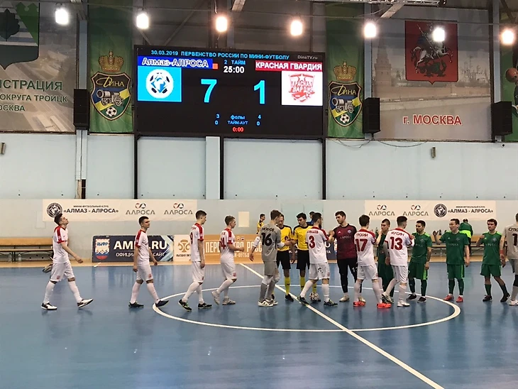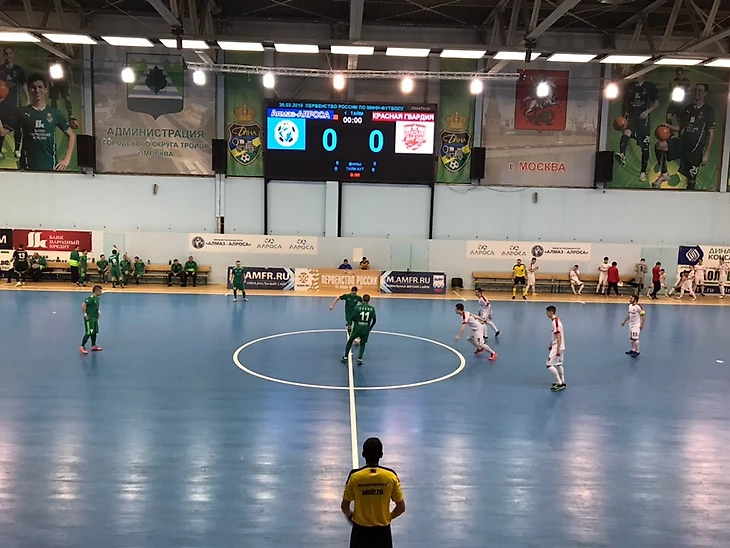 Мини-футбол. 30 марта, суббота. 25 тур первенства России. Высшая лига, конференция «Запад». Встречались команды «Алмаз-АЛРОСА», город Мирный и московская «Красная Гвардия». Репортаж из подмосковного города Троицк.