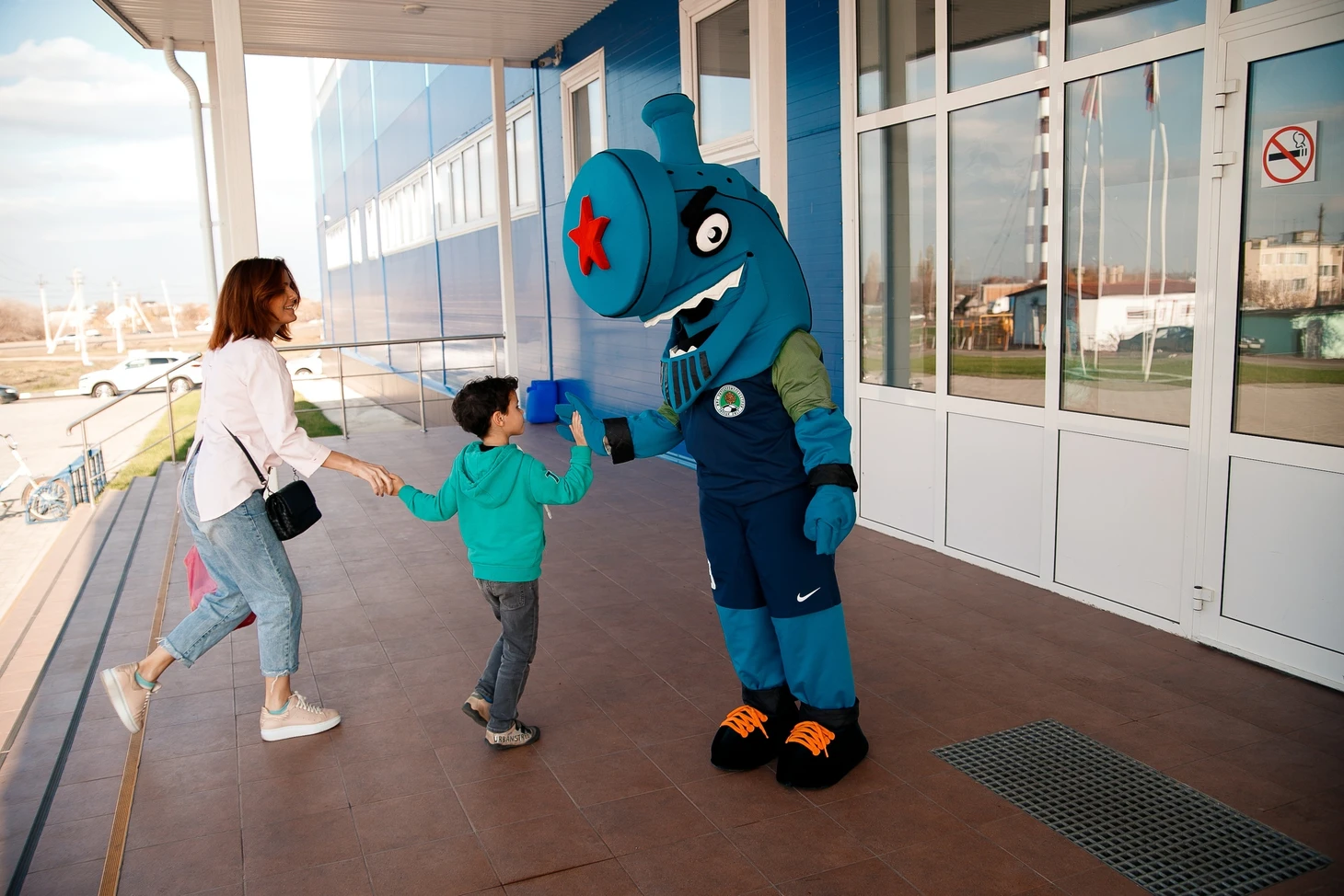 У входа в СК "Атлант" гостей встречает талисман МФК ЛКС паровозик Гром.