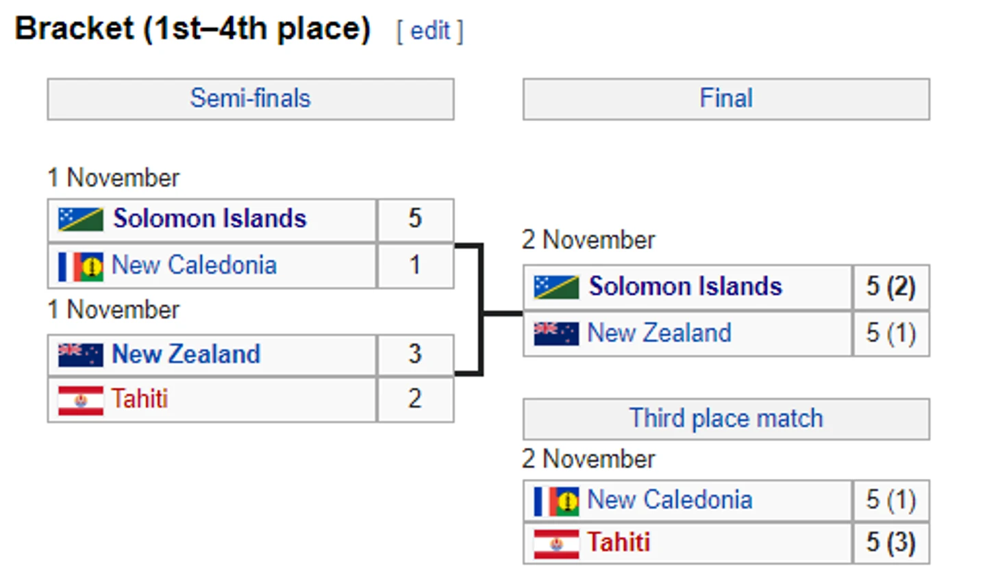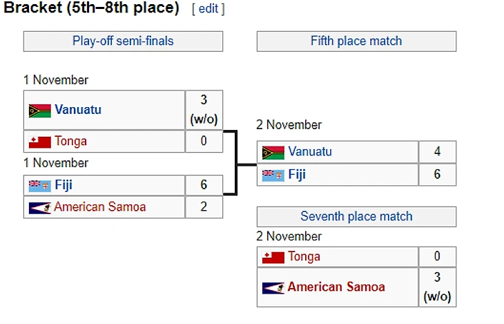 Было аж 2 плей-офф. Ещё и за 5-8 места. Но здесь сразу после группового этапа снялась Тонга, которая с самого начала взялась доказывать, что вы ошибаетесь, если думаете, что остальные 7 команд играют плохо.