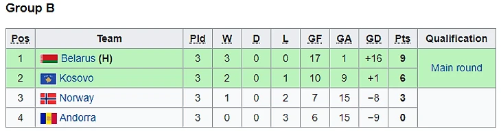 Квартет, где сказалась очевидная разница в классе команд. Беларусы для первой стадии отбора просто звёзды, косовцы крепкая команда, норвежцы никогда звёзд с неба не хватали, а Андорра явный аутсайдер, пусть и сумевший в итоге проявить себя очень боевитой сборной.