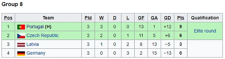 Действующие чемпионы Европы на родном паркете, конечно, заняли первое место. Очень повезло чехам, которые стараются развивать родной футзал, но за группу всё равно должны сказать спасибо. Латвия не уровень элитного раунда, а для немцев само попадание во 2 стадию квалификации за счастье.