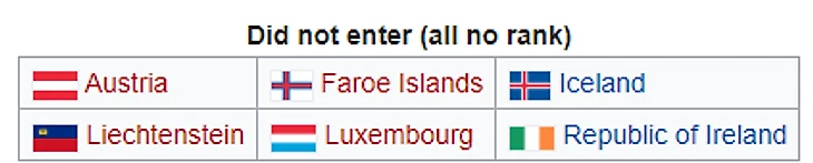 Не участвовали в отборочном турнире Австрия, Лихтенштейн, Люксембург, Исландия, Ирландия и Фарерские острова. Фарерцам и исландцам, наверное, не захотелось далеко плыть, чтобы там быстренько всем проиграть и долго плыть обратно. Возможно, не нашлось и денег на поездку.