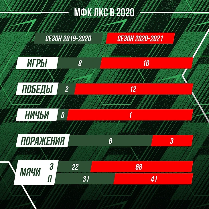 24 игры (сезон 2019/20 – 8, сезон 2020/21 – 16). 14 побед (сезон 2019/20 – 2, сезон 2020/21 – 12). 1 ничья (сезон 2019/20 – 0, сезон 2020/21 – 1). 9 поражений (сезон 2019/20 – 6, сезон 2020/21 – 3). 90 мячей забили, 72 мяча пропустили (сезон 2019/20 – 22-31, сезон 2020/21 – 68-41). Самая результативная игра: 14 голов (ЛКС – «Луч-ГТС», 8:6). Наименее результативная игра: 3 гола («Красная гвардия», «Газпром Бурение», «Волгарь»). Больше всего забитых голов: 8 (ЛКС – «Луч-ГТС», «Норман» – ЛКС). Меньше всего забитых голов: 0 («Газпром Бурение» – ЛКС). Больше всего пропущенных голов: 6 (ЛКС – «Луч-ГТС»). Меньше всего пропущенных голов: 1 («Волгарь», «Новая генерация-д», «Саратов-Волга»). Все игры мини-футбольного клуба ЛКС в 2020 году 11 января «Динамо» - ЛКС – 4:2 Голы: Родин, Орлов – 2, Погосян / Истомин, Кондратьев. 18 января «Красная гвардия» - ЛКС – 2:1 Голы: Трубин – 2 / Муратов. 2 февраля «Газпром Бурение» - ЛКС – 3:0 Голы: Кондратенков, Илько, Целюх. 8 февраля ЛКС – Луч-ГТС – 8:6 Голы: Хейруллаев – 2, Адамов – 2, Хлебин (автогол), Истомин, Зайков, Цай / Турзанов – 3, Ткачев – 2, Черкашин. 15 февраля «Саратов-Волга» - ЛКС – 4:2 Голы: Сырцов, Рахманов, Докучаев, Горбунов / Алханов, Зайков. 22 февраля ЛКС – «Заря» - 5:3 Голы: Ролдугин, Назаров, Хейруллаев, Зайцев, Адамов / Колесов, Габибов – 2. 29 февраля КПРФ-2 – ЛКС – 5:2 Голы: Фомин – 3, Безруков, Мерлушкин / Зайков, Назаров. 14 марта ЛКС – «АЛГА» – 4:2 Голы: Подковыров – 2 / Арсланов, Куликов, Ахмадеев, Низамутдинов. 5 сентября ЛКС – «Саратов-Волга» – 5:2 Голы: Горбунов (автогол), Зайцев, Янник Сомплей — 3 / Кисин, Рахманов. 12 сентября ЛКС – «АЛГА» – 4:5 (Кубок России) Голы: Зайцев, Волошин, Янник, Низамутдинов (автогол) / Низамутдинов, Шамов, Сафаров – 2, Ахмадеев. 13 сентября «ЛГТУ» – ЛКС – 2:6 (Кубок России) Голы: Мелконян, Голышкин / Алханов, Зайцев, Войнов – 2, Зайцев, Янник. 19 сентября «Ростов» – ЛКС – 3:5 Голы: Тренкунов – 2, Сухоруков / Волошин – 3, Зайцев, Гуляйкин. 17 октября «Северная Двина» – ЛКС – 3:5 Голы: Куприн, Уткин, Чарушин / Белоусов, Янник, Паламарчук, Войнов, Волошин. 24 октября ЛКС – «Волгарь» – 2:1 Голы: Алханов, Янник / Штибегов. 31 октября «Газпром Бурение» – ЛКС – 4:1 Голы: Давыдов, Аносов, Райхель, Родин / Назаров. 4 ноября ЛКС – «Новая генерация-д» 7:1 Голы: Зайцев, Назаров – 2, Алханов – 2, Войнов, Евтушенко / Демчук. 7 ноября ЛКС – КПРФ-2 – 3:2 Голы: Войнов — 2, Гуляйкин / Савостьянов, Синцов. 14 ноября «Норман» – ЛКС – 2:8 Голы: Глынин, Навальнев / Янник – 4, Назаров (1:3), Войнов – 2, Белоусов. 21 ноября ЛКС – «Газпром-Югра-д» – 4:2 Голы: Войнов, Белоусов, Гуляйкин, Назаров / Пирогов, Софронов. 28 ноября «АЛГА» – ЛКС – 3:5 Голы: Янник, Мадияров – 2, Алханов, Гуляйкин / Шамов, Ахмадеев, Арсланов. 5 декабря ЛКС – «Спартак-Донецк» – 4:5 Голы: Гуляйкин, Алханов, Филатов (автогол), Белоусов / Свиридов – 3, Тупилко, Станенко. 12 декабря ЛКС – «Голден Игл» – 3:2 Голы: Рычков, Войнов, Янник / Крутый, Зыков. 19 декабря ЛКС - «Спартак» – 3:3 Голы: Гуляйкин, Рычков, Истомин / Малеев, Цай, Адамов. 26 декабря «Саратов-Волга» – ЛКС – 1:3 Голы: Мадияров (а/г) / Гуляйкин, Зайцев, Мадияров.