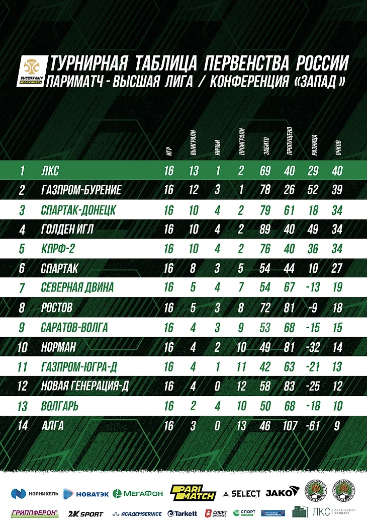 На данный момент мини-футбольный клуб ЛКС занимает 1 место в западной конференции Париматч – Высшей лиги Первенства России. Для липецкого спорта – это историческое событие, команда из Липецка впервые возглавила таблицу Высшей лиги и набрала рекордное количество очков (40 из 48 возможных) после 16 проведённых игр.
