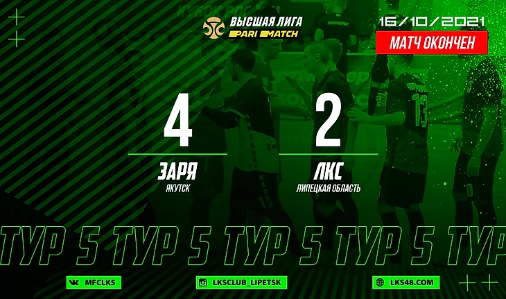 Мини-футбольный клуб ЛКС в 5-м туре Париматч-Высшей лиги конференции «Запад» играл на выезде с МФК "Заря" из Якутска. К сожалению, встреча с бывшим клубом в подмосковном Троицке не принесла главному тренеру липчан Ринату Мусалову положительных эмоций, а ЛКС – очков в копилку. Липчан вновь подвела реализация моментов и ошибки в обороне.