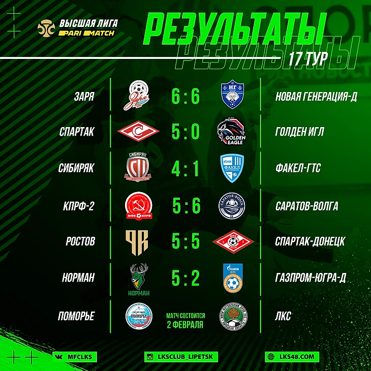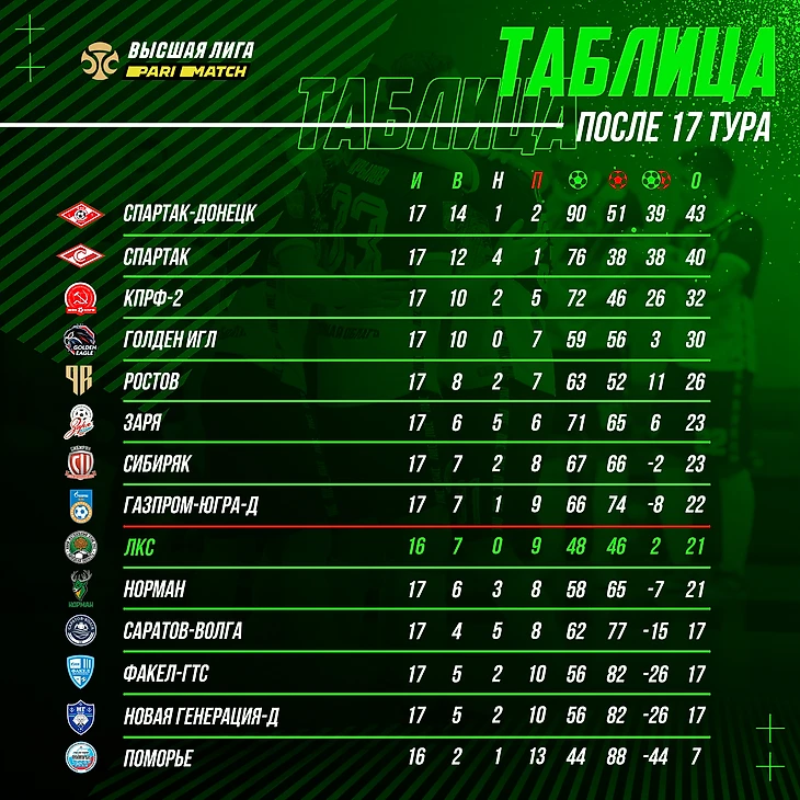 МФК "Поморье" (Архангельская область) - МФК ЛКС (Липецкая область) - матч состоится 2 февраля. Турнирная таблица после 17-го тура: