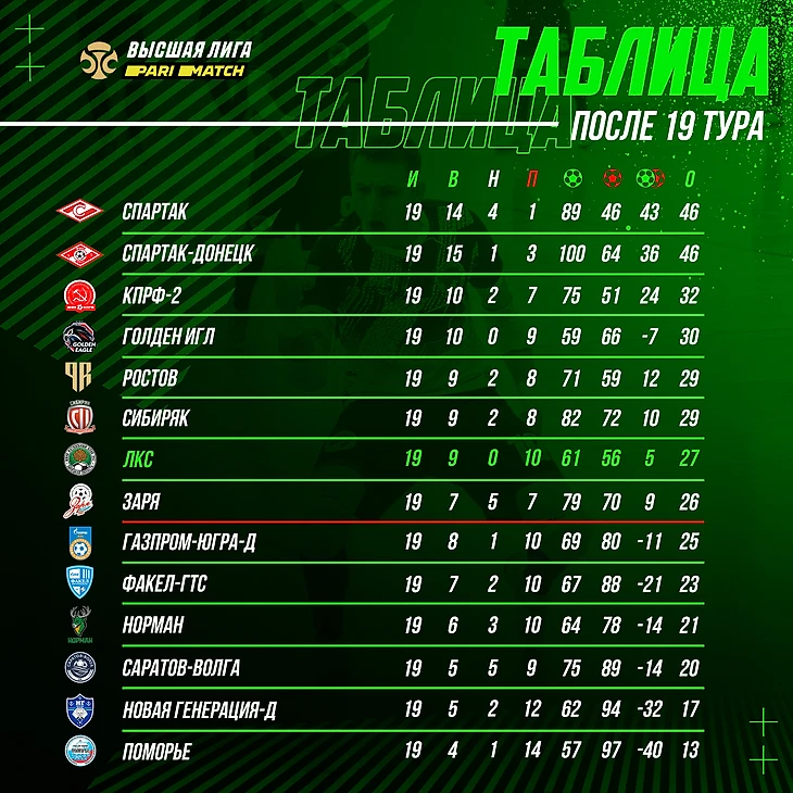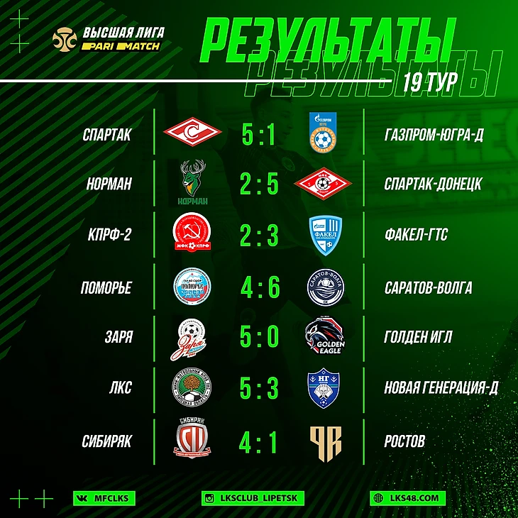 Два "Спартака" продолжают лидировать, ЛКС побеждает "Новую генерацию-д", КПРФ-2 вновь проиграл, а "Сибиряк" сильнее "Ростова".