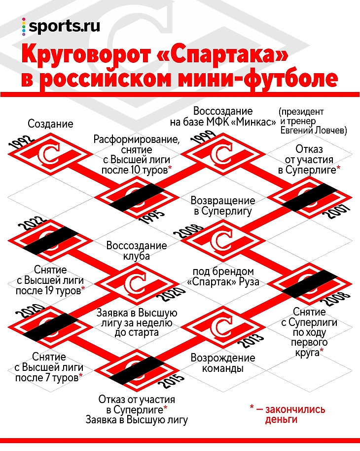 «МФК «Спартак» сообщает о снятии с соревнований команд основного, дублирующего, молодежных составов. Причина – отсутствие финансирования клуба на протяжении нескольких месяцев. Большинство игроков основного состава уже трудоустроено в другие клубы. В ближайшее время РОО «Мини-футбольный клуб «Спартак» прекратит свое существование как юридическая единица», – констатировал смерть клуба официальный сайт.