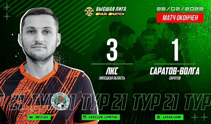 Мини-футбольный клуб ЛКС в 21-м туре Париматч-Высшей лиги принимал на паркете спорткомплекса «Атлант» СК «Саратов-Волга». Состав липчан в трансферное окно усилили три новичка. Из прекратившего выступление в Суперлиге «Динамо Самара» перешли голкипер Родион Залалетдинов и универсал Денис Поваров, а из саратовской команды в ЛКС перебрался один из лучших бомбардиров этого сезона Париматч-Высшей лиги Кирилл Докучаев. В игре с волжанами они заменили в составе выбывших из-за повреждений Леона Геджу, Никиту Евтушенко, Александра Дунца и Сергея Волошина. В состав «Саратов-Волги» вернулся Иван Андреев, родной брат выступающего за ЛКС Ильи Андреева.