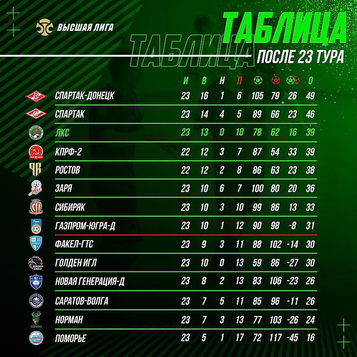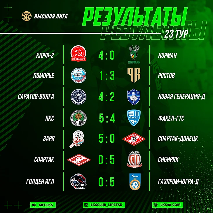 В 24-м туре мини-футбольный клуб ЛКС должен был отправиться в Ростовскую область на игру со «Спартаком-Донецк». Но соперник снялся с турнира, и липчане получат в свою копилку ещё 3 очка. Следующий матч ЛКС проведёт дома с МФК «Ростов» 26 марта.