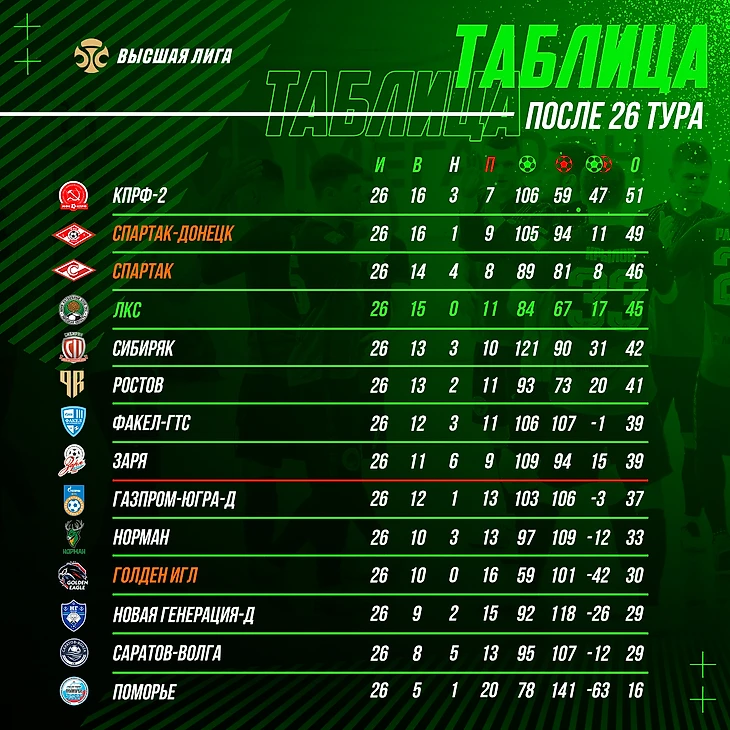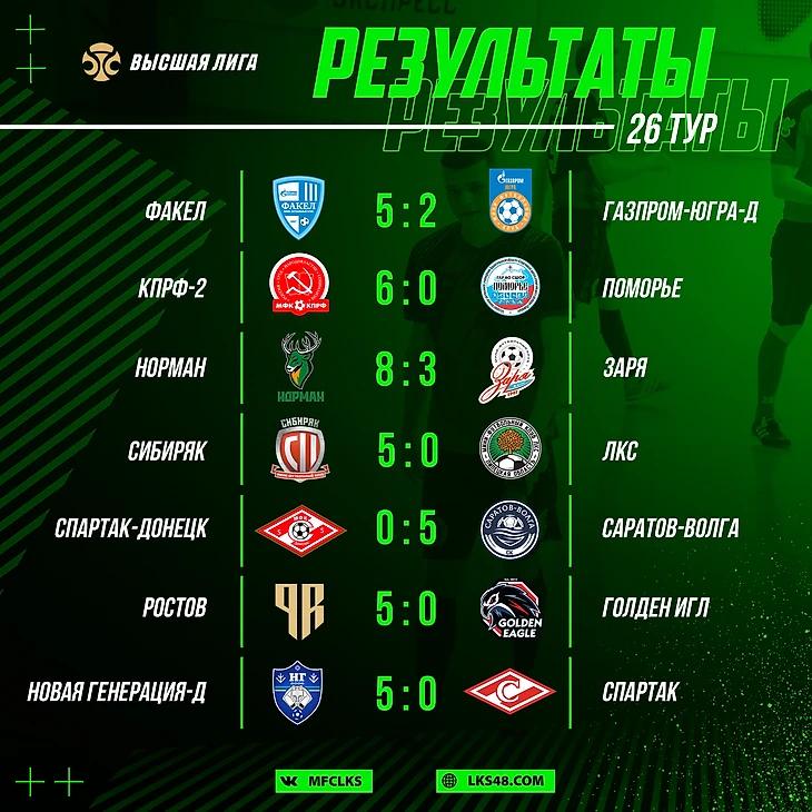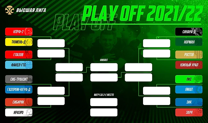 Таким образом, стали известны все участники 1/8 финала. Конференция "Запад" 1 место - СК "КПРФ-2" (Москва) 2 место - МФК ЛКС (Липецкая область) 3 место - ПМФК "Сибиряк" (Новосибирск) 4 место - МФК "Ростов"(Ростов-на-Дону) 5 место - МФК "Факел-ГТС" (Сургут) 6 место - ПФК "Заря" (Якутск) 7 место - МФК "Газпром-Югра-д (Югорск) 8 место - МФК "Норман" (Нижегородская область) Конференция "Восток" 1 место - МФК "Синара-ВИЗ-д" (Екатеринбург) 2 место - МФК "Сиб-Транзит (Новокузнецк) 3 место - МФК "ЗиК" (Екатеринбург) 4 место - МФК "Глазов" (Глазов) 5 место - МФК "Южный Урал" (Челябинск) 6 место - МФК "ИрАэро" (Иркутск) 7 место - СШ "Ямал-НУБК" (Новый Уренгой) 8 место - МФК "Тюмень-д" (Тюмень) Напомним, что в сезоне 2021/22 в плей-офф Высшей лиги по восемь сильнейших команд "Запада" и "Востока" встретятся между собой уже в 1/8 финала. В соответствии с Регламентом Высшей лиги, команда, занявшая более высокое место по итогам регулярного чемпионата, ответный матч играет на домашней площадке.