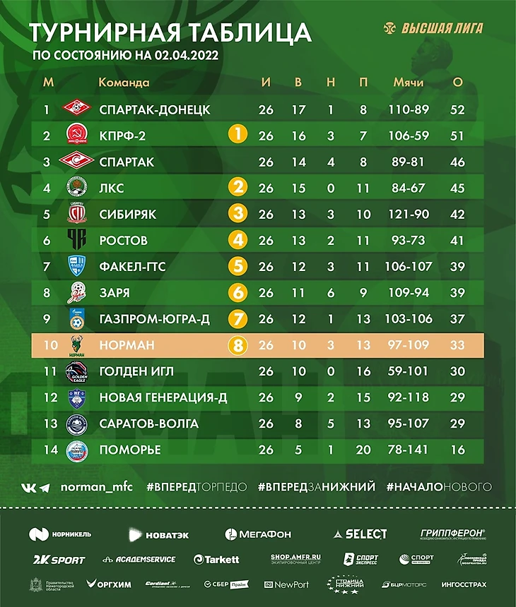 Дубль МФК "Торпедо" на свой второй год игры в Высшей лиге всё-таки сумел забраться в плей-офф. Здесь ситуация обстоит таким образом, что в основном составе у нижегородцев очень большая конкуренция, поэтому в поисках практики в составе "Нормана" в разное время побывало большинство игроков основного состава. Огромную часть своих очков по ходу сезона набрали именно в домашних стенах ФОКа "Мещерский". Именно дома "Норман" попил кровушки у большинства команд из верхней части таблицы. Возглавил нижегородцев по ходу второго круга Дмитрий Чугунов, в первом круге работавший на Востоке с иркутским "ИрАэро". Очень много талантливой молодёжи составляют костяк команды от того часто прослеживалась нестабильность в результате. Играли в большинстве своём безбашенно и не особо задумываясь об обороне, от того порой могли не досчитаться очков в матчах с ближайшими конкурентами. Но 8 место, как по мне, потолок этой команды на данный момент, выше головы они тут не прыгнули.