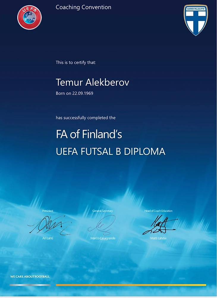 Заключительный модуль и сдача экзамена прошли в феврале в Финляндии. Занятия под эгидой УЕФА проводил хорватский специалист Мико Мартич, главный тренер сборной Финляндии. Вместе с Темуром Алекберовым обучение проходили тренеры из Финляндии, Шотландии, Северной Ирландии, Швеции, Сербии и других стран. Лицензия УЕФА категории В даёт возможность тренировать профессиональные клубы, входящие в европейскую ассоциацию футзала.