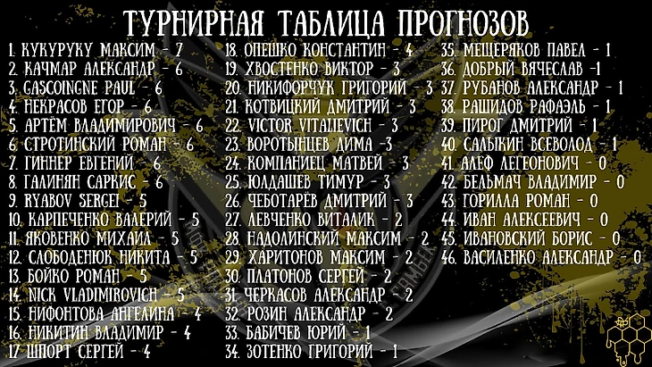 Так же в нашем сообществе проходит турнир прогнозов. Участвуя в котором можно выиграть памятные от нашего клуба. После 6-ти туров появился лидер Кукуруку Максим. Присоединяйтесь и выигрывайте памятные призы от ЛМФК "Родина".
