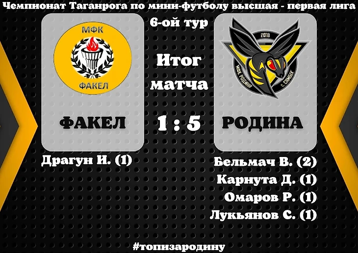 Чемпионат Таганрога по мини-футболу МФК "Факел" 1:5 МФК "Родина" Четвертая очная встреча между командами закончилась победой шмелей. Как я уже говорил в превью к матчу, лёгкой игры не получится. МФК "Факел" набрал неплохой ход и нашли свою игру, пока сыроватую, но всё впереди Естественно у нас были точечные потери перед этой игрой Матч пропускал Виталий Коломийцев. Что немного подпортило настроение желто-черным. До этой встречи руководство клуба успело провернуть отличный трансфер подписав опытного игрока Белоколосова Дмитрия.