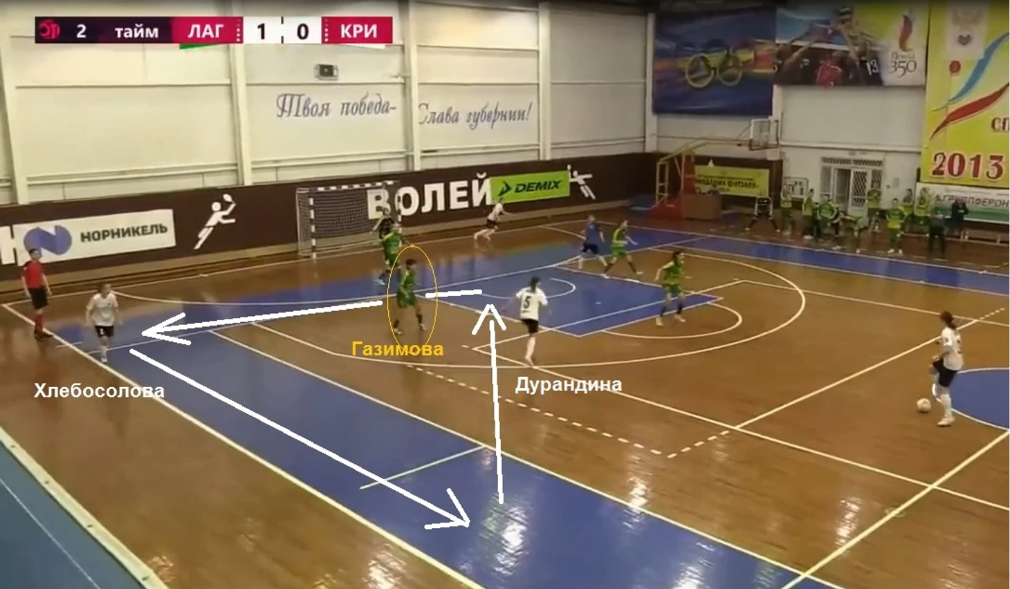 Обратите внимание, в ходе розыгрыша происходит ротация между игроками «Кристалла» Дурандиной и Хлебосоловой. В итоге игрок Лагуны Газимова «села» еще ниже, пытаясь уследить за двумя игроками. Вот уже первая предпосылка для обострения. Если у вас в команде есть «бьющий» игрок, а защитник его не встречает, то почему бы и не пробить по воротам?