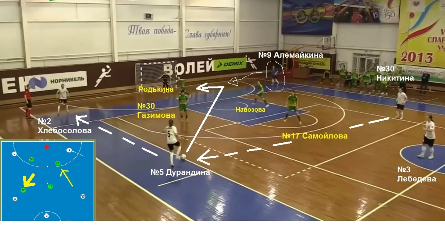 В нижнем углу «скрина» дана схема, показывающая, где должны находиться игроки при эталонной расстановке. Прежде всего отметим, что при таком пасе очень сложно Навозовой успеть «опуститься» занять правильную позицию. Но она молодец, быстро «села», хотя предпосылки для обостряющего паса, как видим, были. И если бы Алемайкина прочувствовала ситуацию, и в момент поперечной передачи Никитиной открылась на дальной штанге, то возможно обострение и последовало бы. В данном эпизоде опять же отмечу, с моей точки зрения, очень пассивные действия Газимовой.