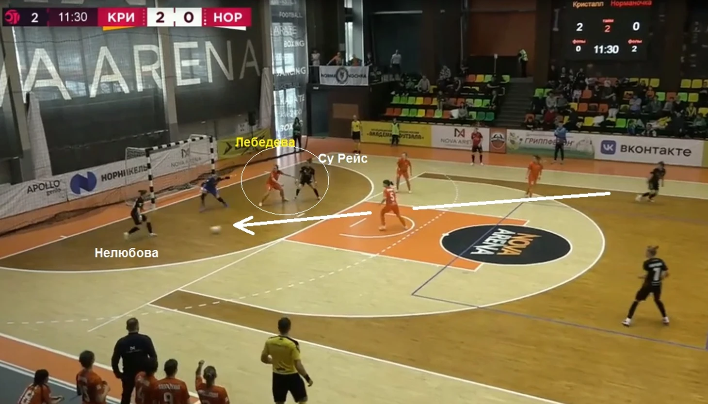 Здесь явная позиционная ошибка Лебедевой, которая увлеклась борьбой с Су Рейс. А её задача была «держать» свою зону, а именно контролировать диагональный прострел. В данном моменте Нелюбова «простила», но было очень опасно.Вот вам и еще одна предпосылка для обострения при игре с пятым. Навязать борьбу и увести соперника, чтобы он забыл закрыть свою зону.
