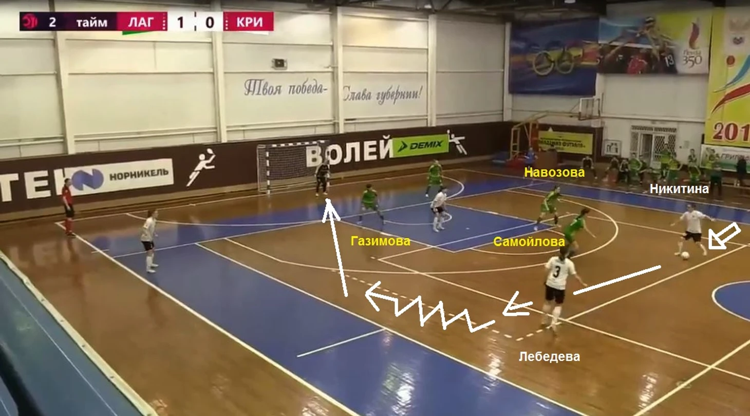 Это перемещение с фланга в центр с мячом Никитиной. С моей точки зрения игроки «Лагуны» не совсем разобрались, кто кого «прихватывает» при этой ситуации. Хотя и не берусь это утверждать уверено, поскольку не знаю,что нарабатывается у них на тренировка. С моей точки зрения Навозова должна была «выброситься» на Никитину, а Самойлова контролировать Лебедеву. По факту Самойлова пошла прихватывать Никитину, и у Лебедевой образовалась свободная зона. Но в любом случае Газимова обязана была «достроить ромбик», выйти выше, а она осталась занимать свою «полупозицию». В итоге Лебедева беспрепятственно получает мяч, сближается с воротами соперника в свободной зоне и бьёт с левой. Гол.
