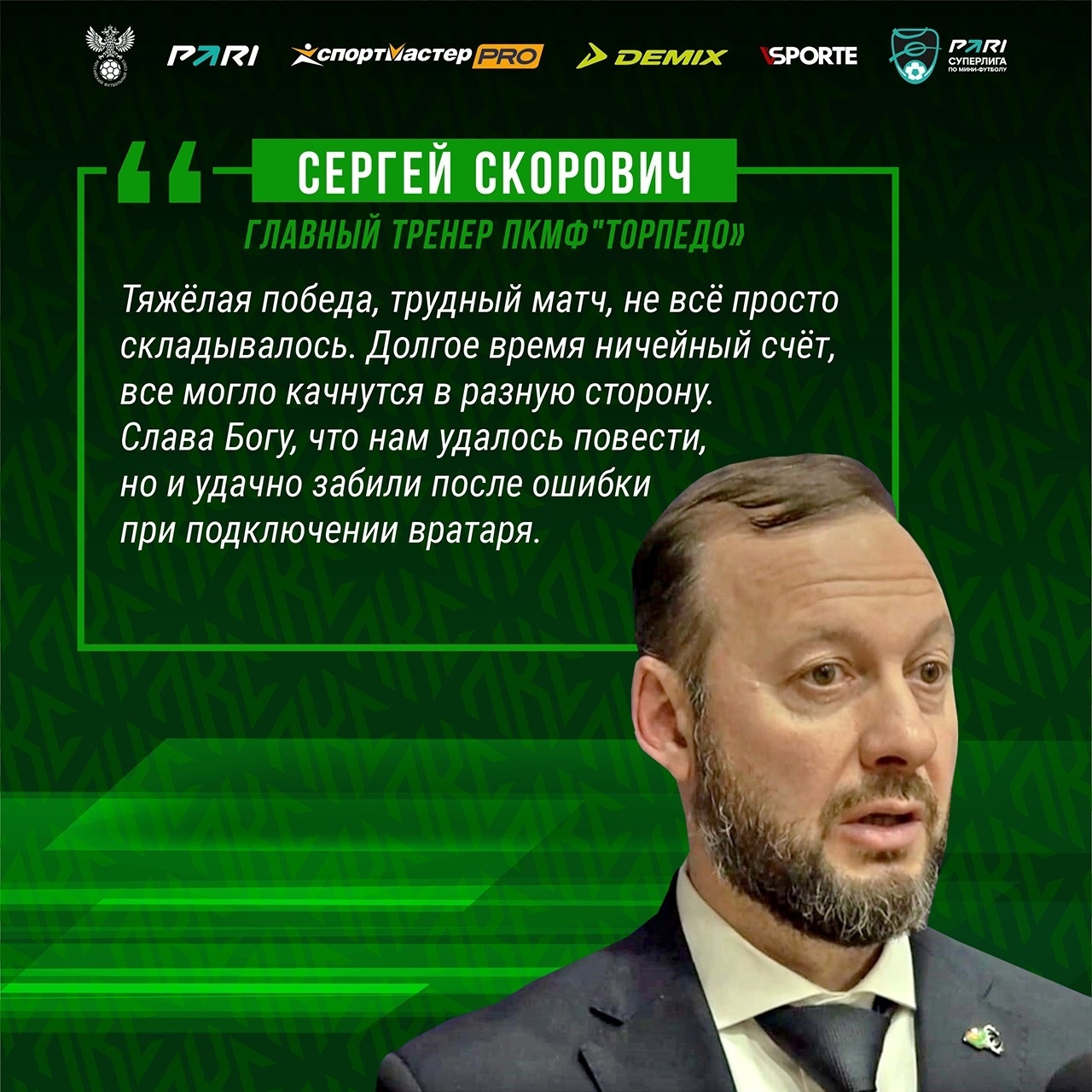 – Тяжёлая победа, трудный матч, не всё просто складывалось, – отметил после игры главный тренер «Торпедо» Сергей Скорович. – Долгое время ничейный счёт, все могло качнутся в разную сторону. Слава Богу, что нам удалось повести, но и удачно забили после ошибки при подключении вратаря. Случилось, что мы ещё забили, не позволили сопернику. В первом тайме в прессинге не дорабатывали, были зазоры большие, изменили в перерыве. Ну и реализация голевых моментов в первом тайме была никакая, от этого 0:0. Плохо возвращались назад в первом тайме, давали возможности сопернику для того, чтобы они могли выходить в преимущество. Но в целом удачно, конечно, я доволен, что 3:0, на ноль сыграли. Будем готовиться к следующим играм.