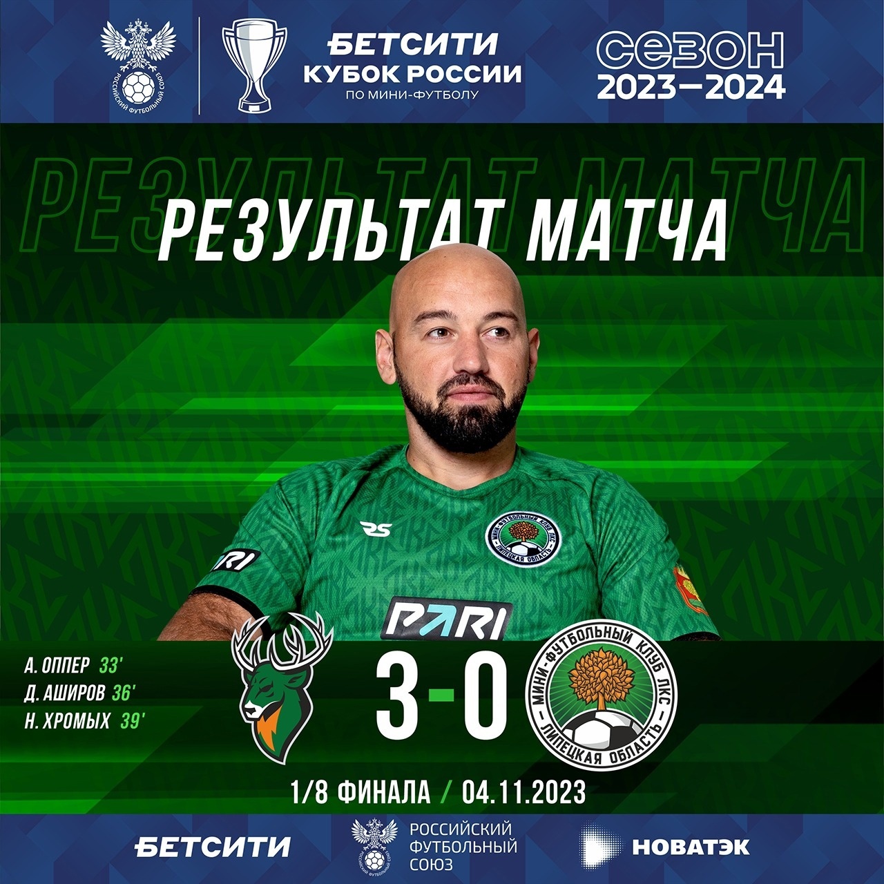 ПКМФ «Торпедо» (Нижегородская область) – МФК ЛКС (Липецкая область) – 3:0 (0:0) БЕТСИТИ Кубок России по мини-футболу среди мужских команд / сезон 2023/24, 1/8 финала, первый матч. 4 ноября 2023 года. ФОК «Мещерский» (Нижний Новгород, ул. К. Маркса, 21). Голы: Антон Оппер — 33 мин (1:0), Денис Аширов — 36 мин (2:0), Никита Хромых — 39 мин (3:0). Фолы: 1 тайм — 2/1, 2 тайм — 5/2.