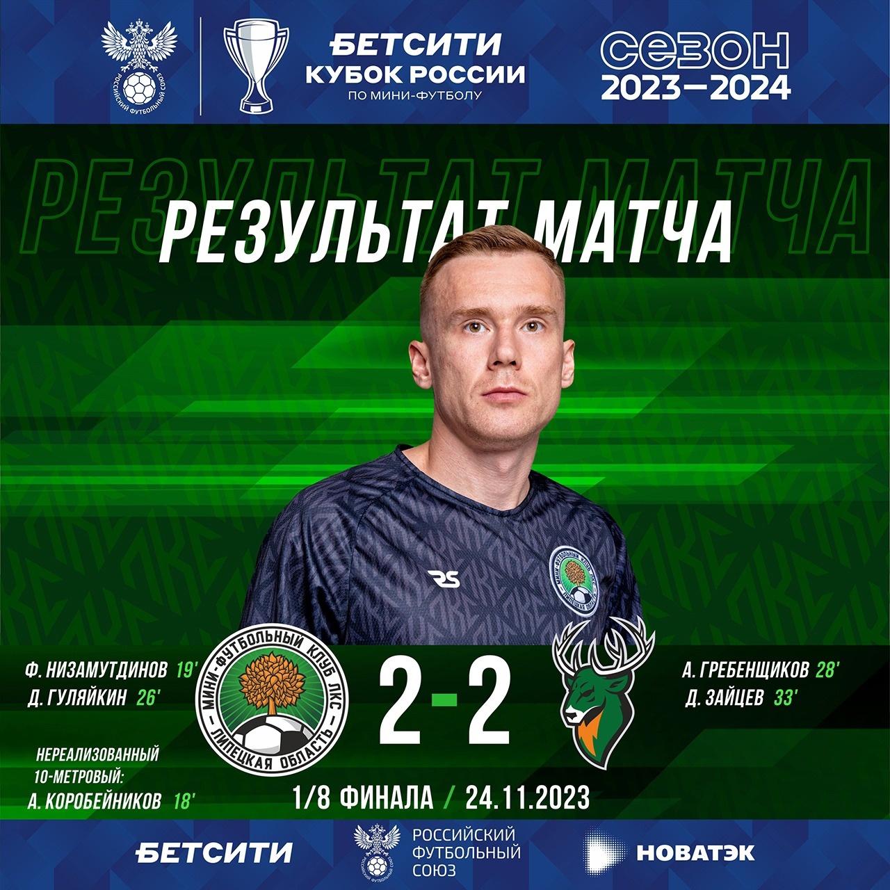 МФК ЛКС (Липецкая область) – ПКМФ «Торпедо» (Нижегородская область) – 2:2 (1:0) БЕТСИТИ Кубок России по мини-футболу среди мужских команд / сезон 2023/24, 1/8 финала, второй матч. 24 ноября 2023 года. УСК «Атлант» (Липецкий район, Копцевы Хутора, ул. Котовского, 1В). Голы: Фидан Низамутдинов — 19 мин (1:0), Денис Гуляйкин — 26 мин (2:0), Александр Гребенщиков — 28 мин (2:1), Дмитрий Зайцев — 33 мин (2:2). Нереализованный 10-метровый: Александр Коробейников – 18 мин. Предупреждения: Александр Коробейников, Александр Дунец / Габриэль, Александр Гребенщиков, Дмитрий Зайцев, Иван Обжорин. Фолы: 1 тайм — 5/6, 2 тайм — 5/5.