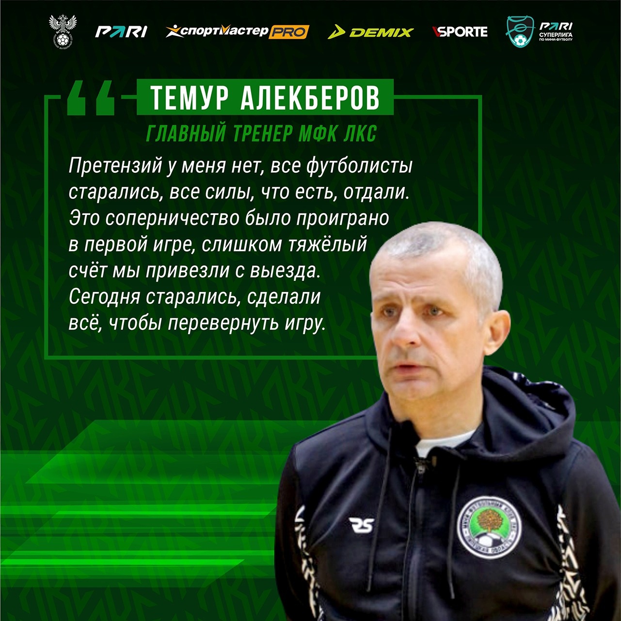 – Задача очень сложная, трудно отыграть без ошибок, без моментов, – прокомментировал игру главный тренер ЛКС Темур Алекберов. – Мы подобрались достаточно близко, но для этого потратили очень много сил. Старались много рисковать, но стали допускать ошибки, потому что подустали. Интенсивность игры очень высокая, нам приходилось много прессинговать. В какие-то моменты мы ошиблись при счёте 2:0. Можно было постараться дотерпеть и с одним голом прийти к концу игры. Претензий у меня нет, все футболисты старались, все силы, что есть, отдали. Это соперничество было проиграно в первой игре, слишком тяжёлый счёт мы привезли с выезда. Сегодня старались, сделали всё, чтобы перевернуть игру.